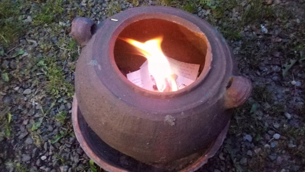 Finalmente se hizo un ejercicio práctico en el que muy al interior de cada uno, se reconocía esas heridas que hemos recibido, se plasmaron sobre un papel y se pusieron en manos de Dios y la Virgen generando un pacto para curar esas heridas (un diálogo con El, la Virgen y consigo mismo). Finalmente lo expuesto en el papel quedó en cada uno y se quemó en una vasija de barro que simbolizaba soltar dichas heridas quemar las ofensas.