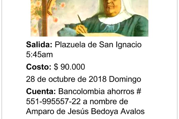 Este domingo 28 de octubre nos vamos de peregrinación a Jericó… recorreremos las calles de este municipio, la casa donde creció la Madre Laura y la Parroquia. Disfrutaremos en un ambiente de oración y de fraternidad de los sitios que marcaron la infancia de la primera Santa colombiana. Mayores informes:...